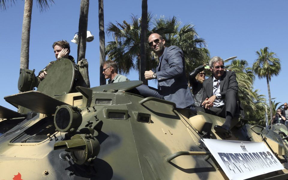 The boys are back: From second left, Dolph Lundgren, Jason Statham and Harrison Ford ride atop an armored vehicle during a photo call for ‘The Expendables 3’ at the 67th international film festival in Cannes, southern France, in 2014. The latest sequel is due to start shooting in Greece on October 30.