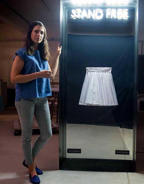 The present installation may again be about freedom, but there’s little movement in it, or communal enjoyment. It is meant to be seen by one person at a time, standing before the display. Markings on the ground show where the viewer needs to stand so that they can imagine themselves wearing the fustanella (although the one-size-fits-all suggestion may find the garment awkwardly draped on some people). The installation is accompanied by a recorded message which the audience can access through their cellphone’s QR code app. Fragoudaki wants the lone spectator watching him or herself becoming part of the installation to enter into an internal dialogue that should console or inspire reflection.