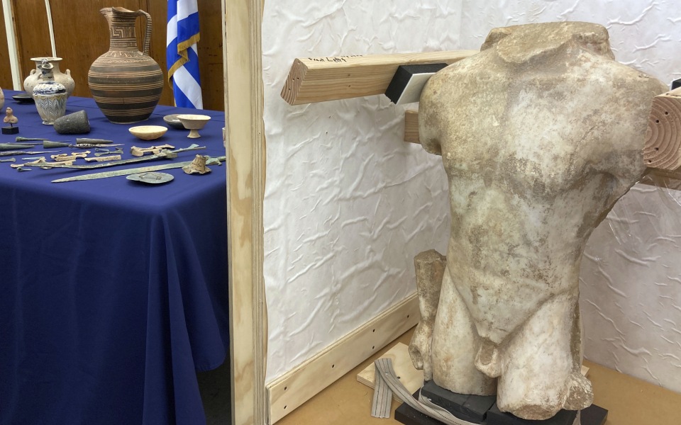 The artifacts included a sculpture of a young man from about 560 B.C., known as a kouros, that is worth $14 million, Manhattan District Attorney Alvin Bragg said.