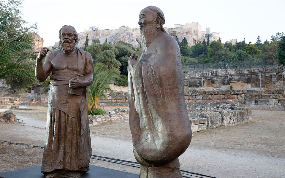 The statues of Socrates and Confucius at the archaeological site of the Ancient Agora in Athens.