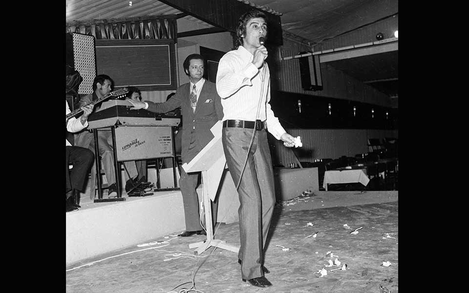 Greek singer Tolis Voskopolous is seen performing at an Athens nightclub during a celebration of AEK’s European soccer cup title in 1971, during the heyday of a career that spanned six decades.