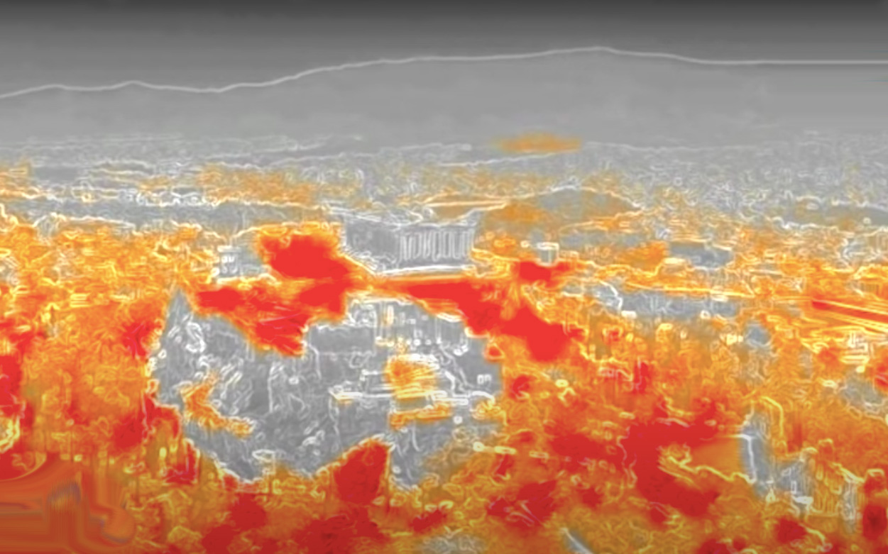 A video created by Up Stories and meteo.gr using a thermographic camera shows the extreme temperatures at the Acropolis hill and Omonia square in Athens. Appearing in deep red, the temperature of the container offices on the hill, as well as rooftops and asphalt roads, reportedly reached 77°C. The large round fountain at Omonia Square, meanwhile, built to help lower the temperature in its vicinity, appears in dark blue.