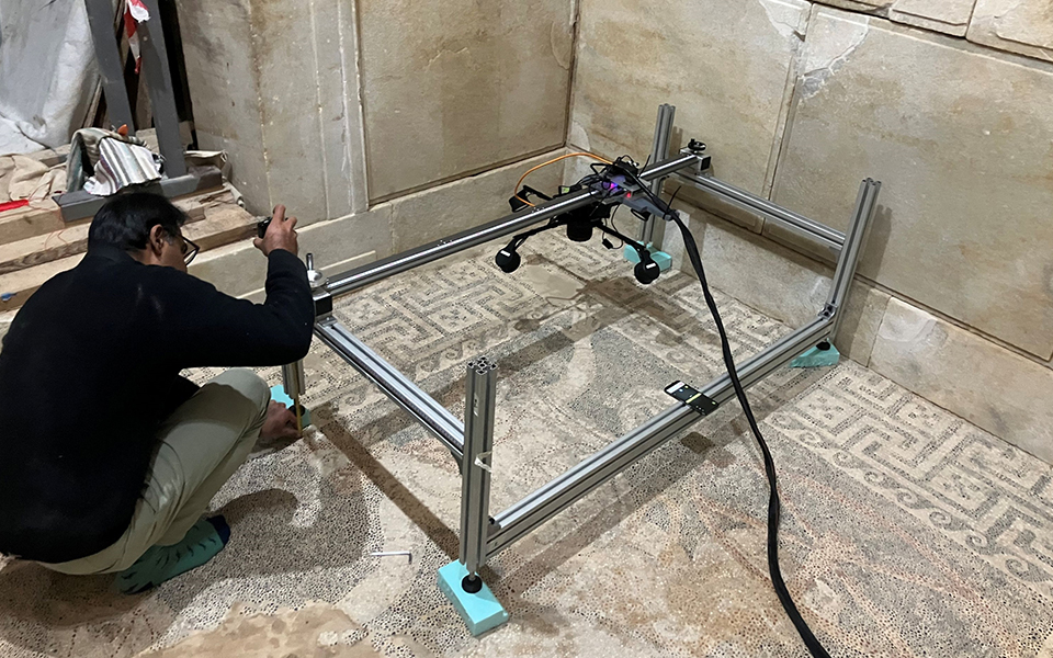A researcher records the Persephone Abduction mosaic at the Kasta Tumulus in Amphipolis using photogrammetry. The polychromy of the monument’s decoration will be studied and digitally showcased by the National Hellenic Research Foundation and the “Demokritos” National Centre for Scientific Research, as part of a project commissioned by the Ministry of Culture.