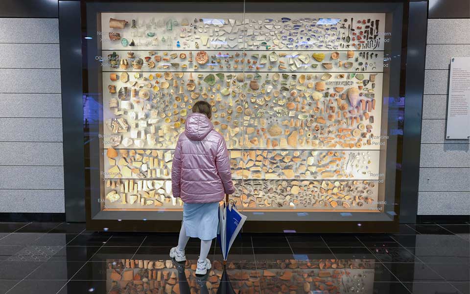 Aghia Sophia Station: A young passenger at the Thessaloniki Metro observes fragments of oil lamps, amphorae, and pottery displayed in the showcase at Aghia Sophia station. These artifacts illustrate the city’s stratigraphy from its founding in 316/315 BC to the Great Fire of 1917.