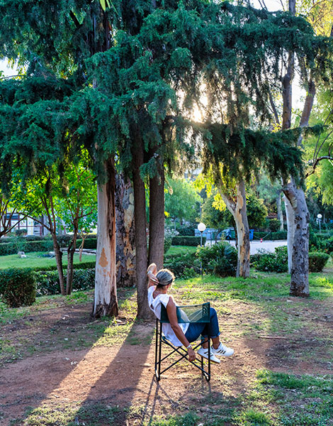 When the organic market winds down around half past five in the afternoon, the older residents of Kaisariani begin their customary stroll through the park, before pausing in the shade of the pines or cypresses near the Altar of Freedom. Around that time, the rest of the park’s “tribes” appear: mothers with small children, boys on bicycles, groups of teenage girls, dog owners, and those simply seeking a breath of fresh air away and a break from the city’s busy rhythm.