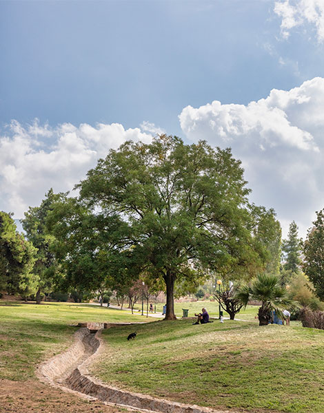 Entering the park from the southern gate on Iroon Skopeftiriou Street, you may find your gaze drawn to the tall pines that shade the paths. The midday stillness is broken only by the sound of cicadas. The calm of the place quickly wins you over, even as you take in the abundant and sometimes even defiant graffiti scrawled across nearly every concrete surface.