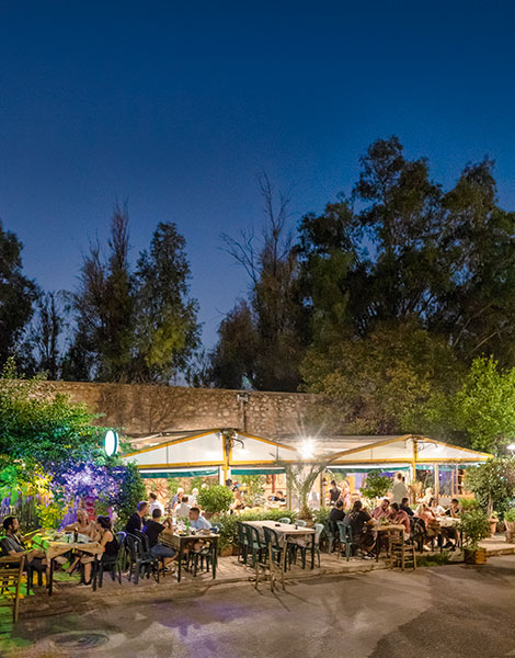 That night, Nino Rota’s immortal Godfather theme filled the night air and the chatter of children playing in the park faded away. After the film, we shuffled out of the cinema area and into the park, where a few young rappers were testing their freestyle skills under the trees. Our walk ended a little further east, at Tsobanakos, a taverna that feels like an integral part of a visit here. We watched as Theofilos Kanonieris peeled potatoes by hand, and the grill team carefully placed thinly cut lamb chops over the charcoal, preparing a specialty that draws diners from all across Athens.