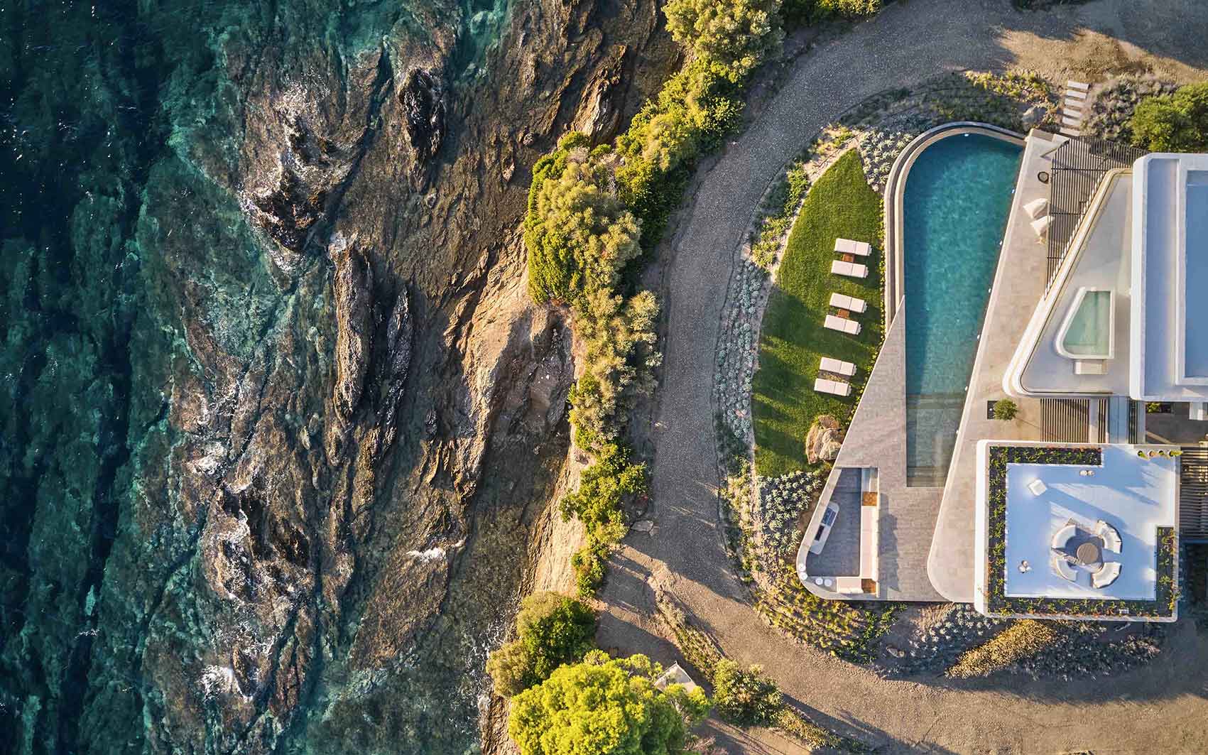For a dip in the sea, guests can follow a private natural path leading to a small rocky enclave. The villa also has a heated pool, BBQ, a wind-sheltered dining area, key modern amenities like a flat screen TV and WiFi access, and a helipad. Services include VIP transport, a daily housekeeping and concierge travel assistance.