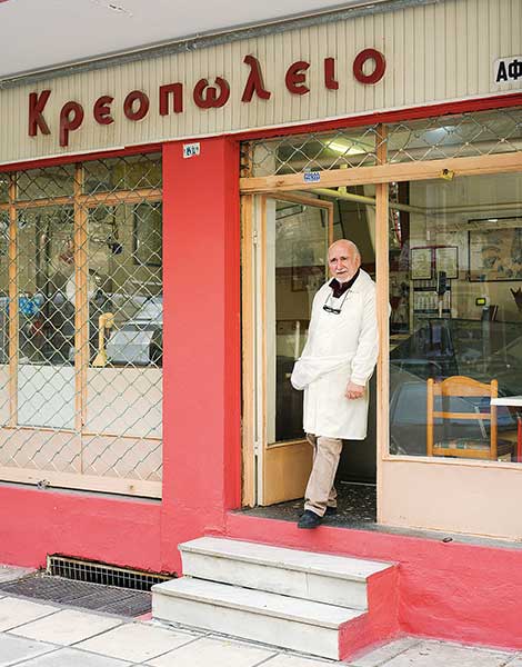 Outside his corner shop, at the intersection of Olympou and Arrianou streets, 81-year-old butcher Vangelis Kotsabas feeds the seagulls every afternoon. It’s a ritual he’s kept for years, much like the Friday ouzo get-togethers with friends. Since 1978, when he took over the butcher shop with his brother Nikos, the neighborhood has changed dramatically. And yet, it has retained its human dimension.