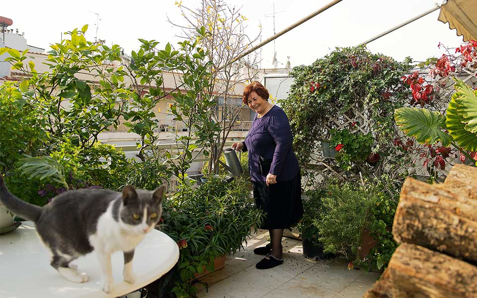 Olga Iakovidou on the balcony of her home at the beginning of Olympou Street.