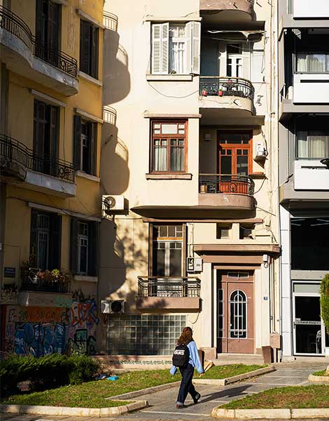 Running parallel to Egnatia Street, just to the north, Olympou connects the Rotunda in the east with the Byzantine Church of the Holy Apostles in the west, a UNESCO World Heritage Site. Along its nearly three-kilometer stretch, remnants of the city’s Hellenistic core at Dioikitiriou Square coexist with the Roman Forum of the 2nd century AD, emblematic interwar buildings such as the Experimental School designed by architect Dimitris Pikionis, historic shops like the Heraklis nut store, and cafés frequented by digital nomads.
