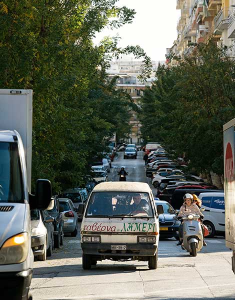 She likes Olympou, she tells me, because it’s full of surprises and contrasts, like the Thessaloniki Labor Center, the underground theater lounge of Politeia Theatrou, and Pikap, a café-bar, record library, radio station, and exhibition and concert space that has been a local cultural hub for the past decade.