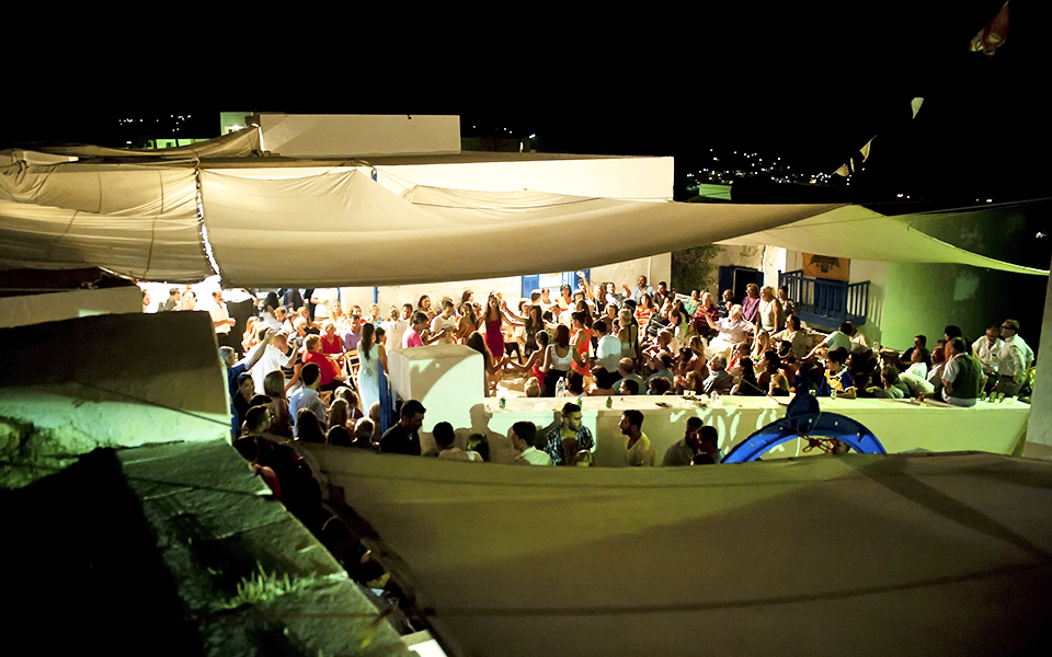 In Emporio, a mountain village built on Nisyros’ northern ridge, the main panigyri is held in a amphitheater-like space where one can clearly see and hear the band regardless of where one is sitting. Locals and visitors sit together at large tables and strangers rapidly become friends, eating, drinking and dancing together.