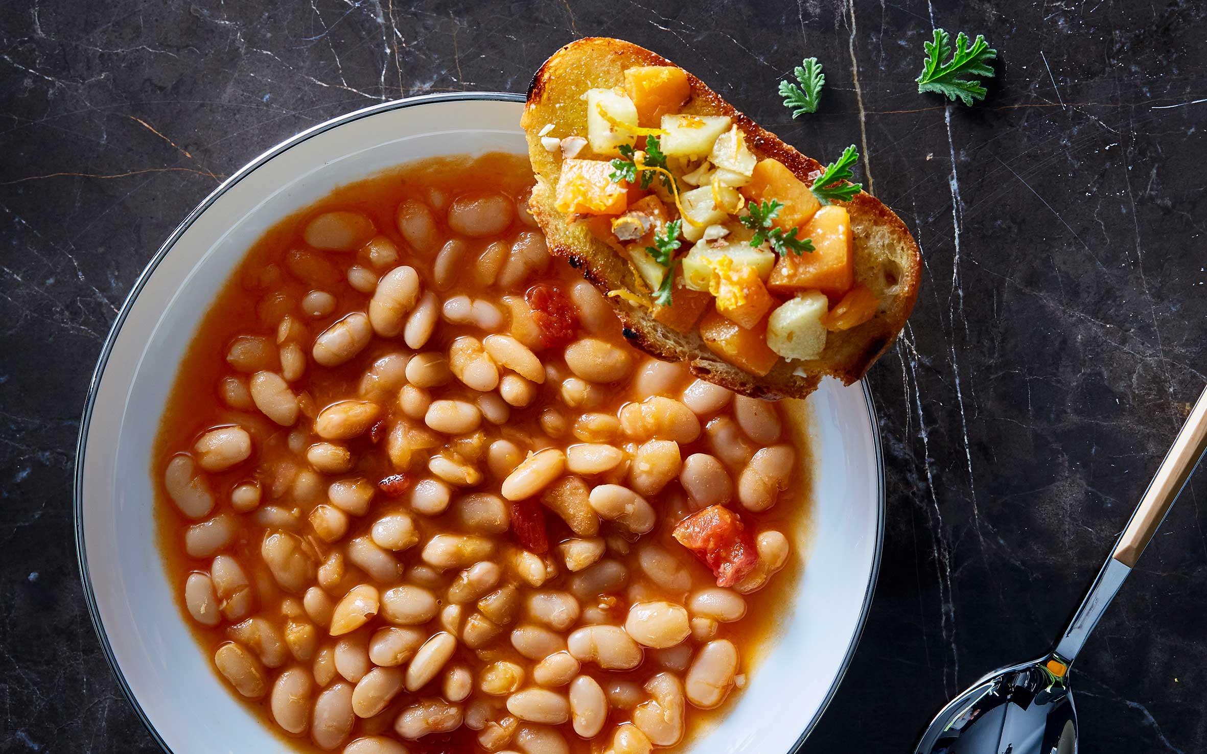 Plenty of fall flavors unite in this creamy alternative fasolada (traditional bean soup). Normally a simple fare, this seasonal version could easily please guests at your next dinner party, especially when served with a nice bruschetta on the side.