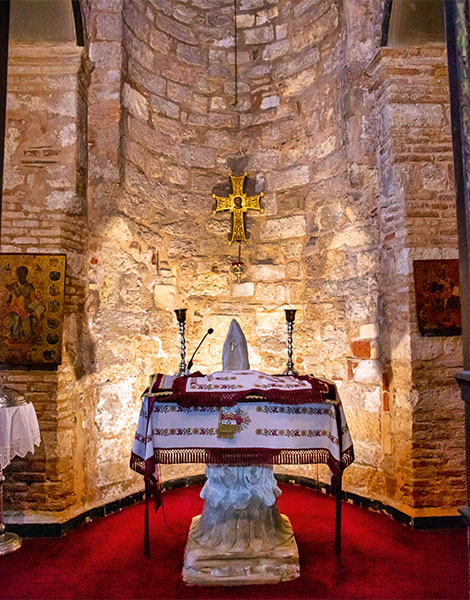 The original church, which today makes up half of the current one, was a simple, four-column cruciform structure. Its construction used architectural pieces taken from ancient buildings, including an inverted chapiter on the northeast side, a column at the entrance to the courtyard, and an inverted marble chapiter in Corinthian style which supports the sanctuary.