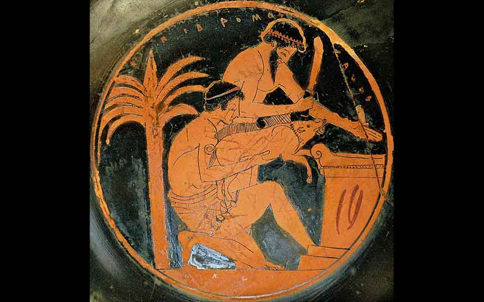 Meat was often roasted or boiled for public consumption after a blood sacrifice to the gods. Here, two men prepare to sacrifice a pig (Attic red-figure cup, 510–500 BC, by the Epidromos Painter).