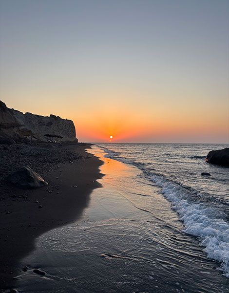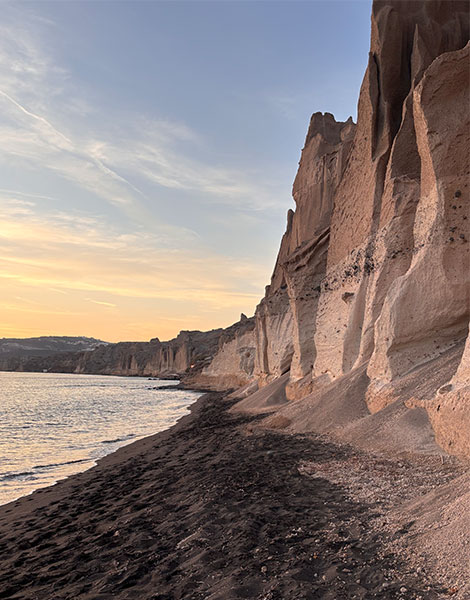 While Oia may be famous for its sunsets (and the crowds that applaud them), quieter alternatives abound. Along the road to Akrotiri, there are many great spots to enjoy the view, with highlights including the Akrotiri Lighthouse or the Venetsanos Winery, where you can watch the sunset with a glass of wine in hand. Alternatively, climb to Pyrgos Kallistis Castle, a medieval hilltop village with narrow alleys and panoramic vistas that capture the island’s full beauty at dusk.