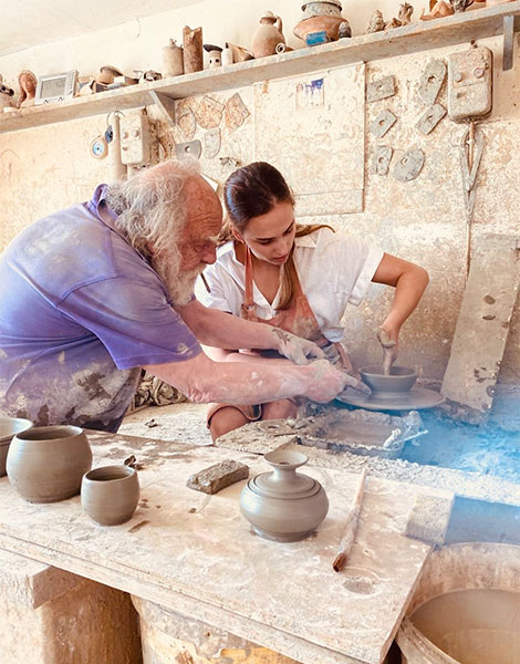 In Megalohori, you can take pottery lessons at the workshop “Homa & Nero” (Earth & Water). There, Andreas Makaris, one of the island’s most renowned ceramists, will introduce you to the art of ceramics while also sharing stories about old Santorini. A warm welcome with a glass of wine or tsipouro, authentic conversations, and his unique sense of humor make the class an unforgettable experience.