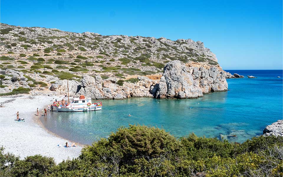 Our group of tourists and locals set off on Captain Nikos’ boat from Diafani in the morning, when the fog descending from Olympos enveloped the high mountain peaks whose steep cliffs, riddled with caves, serve as a refuge for Aegean gulls and wild pigeons. It felt as if we were sailing towards some mythical land, particularly when the entire boat entered the Tourkalas sea cave, with its incredible crystal-clear waters, and everyone took a dip in the sea. And suddenly, out in the open water again, a miracle occurred as dolphins accompanied us for a while! As we crossed the Saria Strait, the narrow channel which separates northern Karpathos from the islet of Saria, there appeared a breathtaking bay with shimmering emerald waters gently caressing the pebbles on the beach. The morning sun gilded the enormous boulders, perfectly interlocked and rising proudly among the wild grass and thorns, indifferent to the passage of time and the fury of the elements.