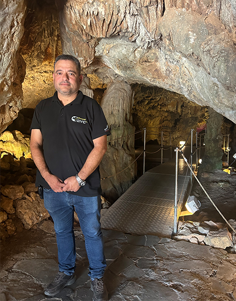 Anastasis Parasiris welcomes us to the Sfendoni Cave, at the foot of Psiloritis Mountain, in central Crete. In this impressive natural wonder that during its history served as a refuge for local revolutionaries, the young Cretan tour guide with his characteristic accent and stentorian voice guides visitors throughout the year, telling the story of the cave as if it were the first time.