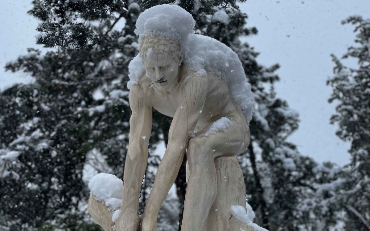 The 1908 "Xylothravstis" (Wood Breaker) statue located opposite the Panathenaic Stadium in Athens covered in snow.