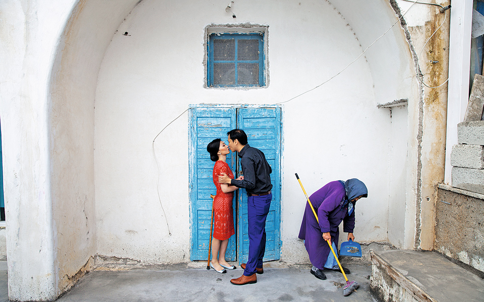 Just married: One of the thousands of Chinese couples who exchange vows in Santorini, gets artistic.