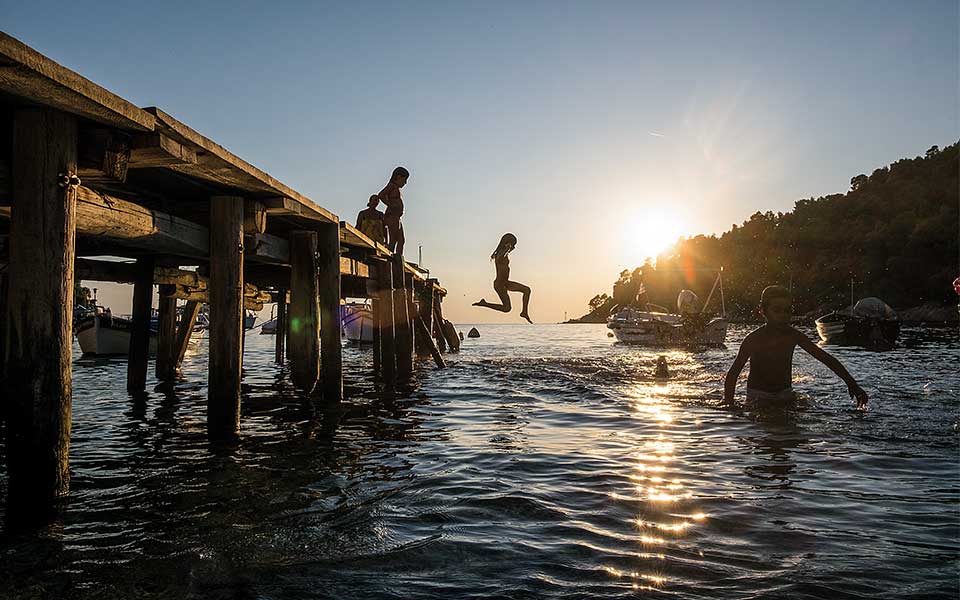 August plunges in the seaside village of Agnontas in Skopelos.