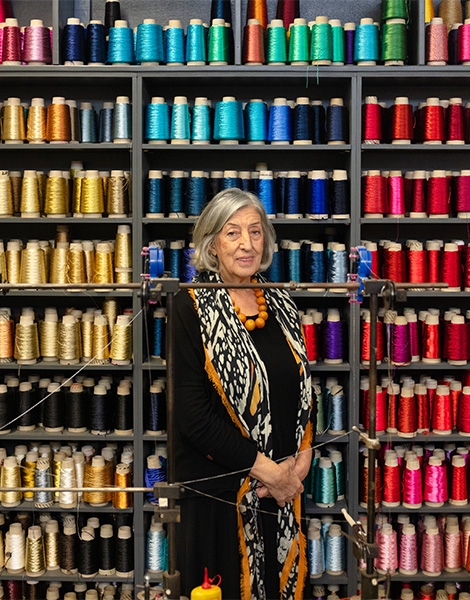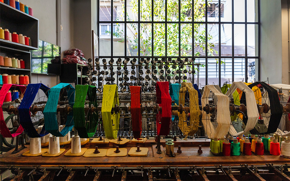 “Here, you will see threads of silk, cotton, or rayon, as well as works made from elaborate yarns,” explains Ms. Matseli as we walk among spinning machines and the people operating them.