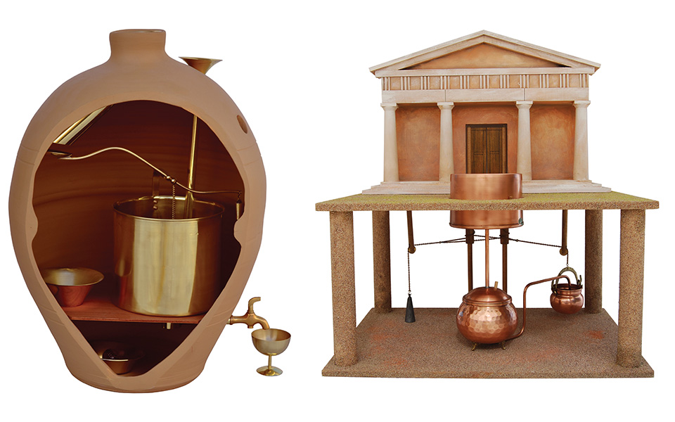The first vending machine in history (left) and the automatic opening of temple doors at the Museum of Ancient Greek Technology by Kostas Kotsanas.