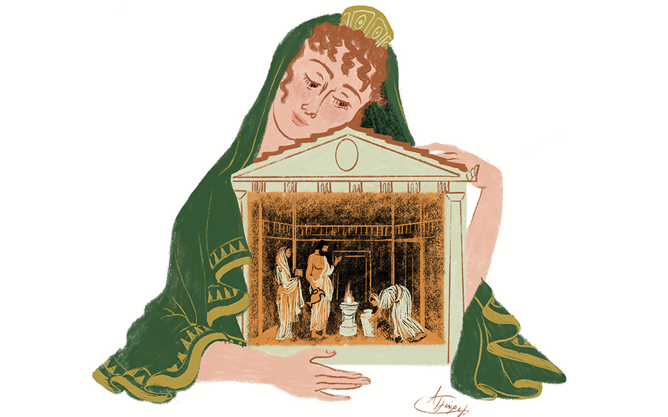 In public, Hestia was worshiped in the Prytaneion in particular, a multi-purpose building that served as the Archons’ official residence and provided VIPs with meals at state expense. It also held the city’s symbolic central hearth and ever-burning sacred fire. Statues of Eirene and Hestia were placed there, according to Pausanias. Despite archaeologists’ past uncertainty, the Prytaneion is believed today, based on convincing new evidence, to have stood east of the Theater of Dionysus and Cave of Aglauros, beside the Street of the Tripods, near Athens’ original pre-Classical agora.