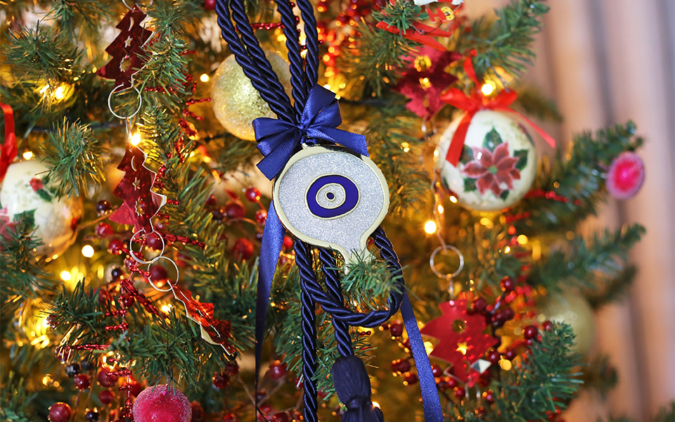 Old meets new: a decorative evil eye charm brings a traditional note of good fortune to a modern Christmas tree.