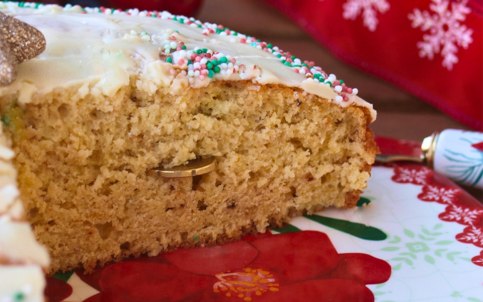 Vasilopita, the traditional Greek New Year cake, sliced in anticipation – the hidden coin promising good luck for the year ahead.