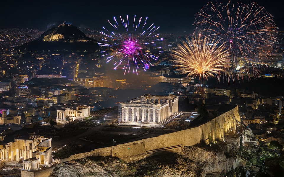 New Year’s fireworks light up central Athens, with the Acropolis watching over the city as one year gives way to the next.