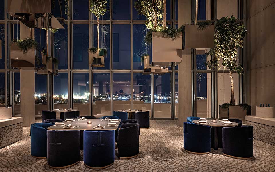 On October 4, Delta opened its doors to the public for the first time, who are curious to experience, take pictures and wander around the space designed by Stelios Kois. A space that exudes a welcoming intimacy and a deeply Greek mystery at the same time. “We wanted people to have a holistic perspective as soon as they arrived, one that allows the eye to travel without interruptions,” says Mr. Kois. However, there is no doubt that all eyes are on the circular, curvy bar created by artists Andrea Voukenas and Stephen Petrides of the voukenas petridis firm, which radiates energy from the most central point of the restaurant.