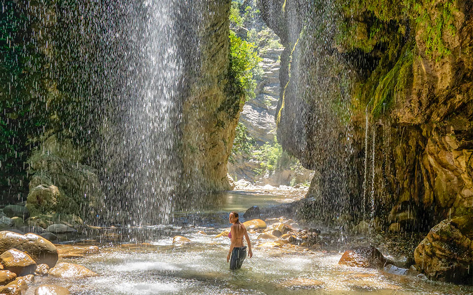 The trek through the river offers many opportunities to stop and admire the beautiful scenery, however your longest stop will be at the falls at Panta Vrechi, where the waterfalls and the watery curtains run constantly for 100 meters or so of the gorge. You will also make a stop at the concrete bridge below Kontiva, to decide whether to double back or continue up the mountain (in a change of dry clothes).