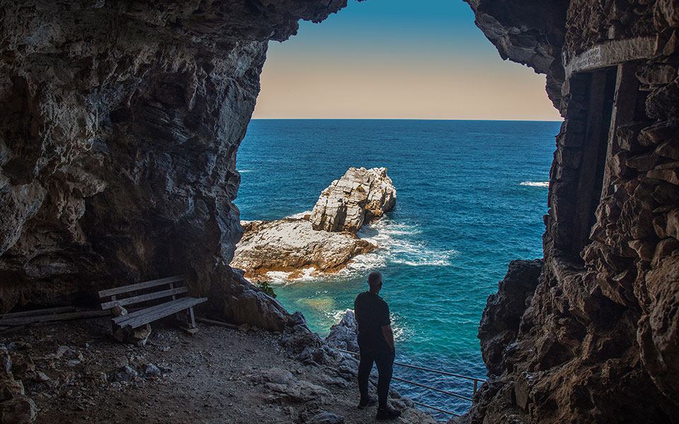 On another route, we descend to the “Hidden School” and the rock-hewn Chapel of Panaghia Megalomata, following the trail from Fakistra toward Damouchari. Here, village volunteers have nearly finished restoring the stone steps and reinforcing the ropes that protect hikers from slipping into the sea.
