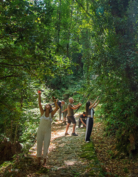 During our four-day trek in the area, the Association guides us to already restored sections of different kalderimia. On one of them, we pass through the gorge that leads to much-photographed Fakistra. Here, deep in a chestnut forest, the cement bridge that once connected the two sides of the mountain had been washed away. “The lay of the land didn’t allow us to rebuild on the same spot. With the help of engineers, we created a detour, carved a new route, and constructed a wooden bridge using fallen trunks,” says Martzos. Crossing the nearly five-meter bridge under a canopy of wild vegetation, I felt like I had stepped into an Indiana Jones film.