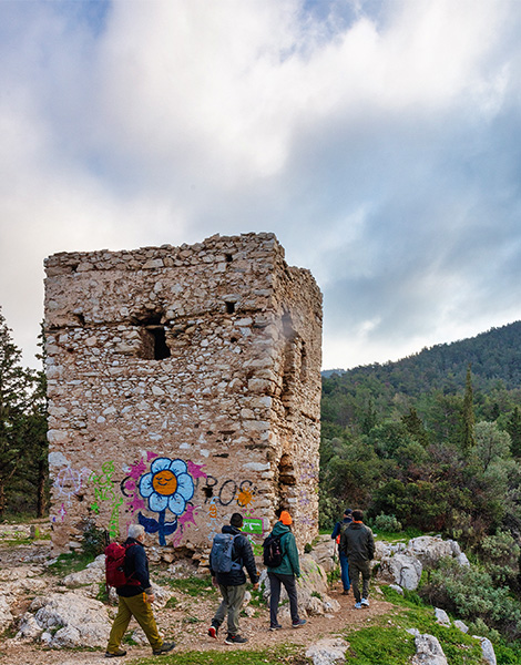 Before long, the Tower of Anthousa, also known as the Koula of Ymittos, comes into view. Known by its Turkish name, it has stood in ruins since 1722. Although little documentation survives, its architecture suggests an Ottoman origin rather than Byzantine or Frankish. According to the guides, it was likely one of many koulades built across Greece until the 18th century, serving as watchtowers overseeing estates (chifliks), residences for local aghas, or military outposts.
