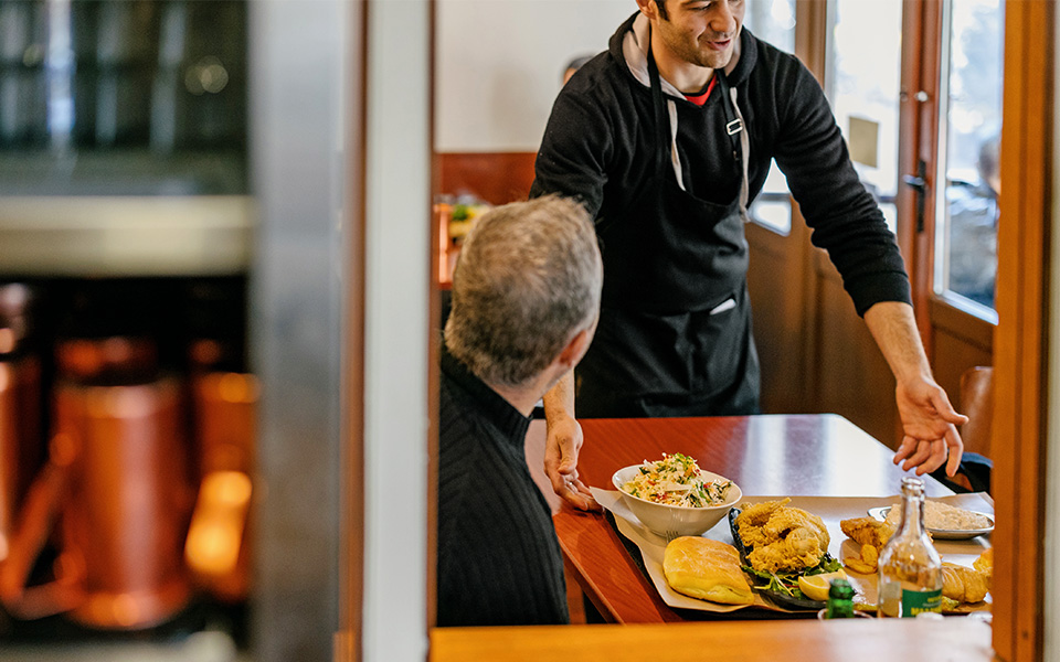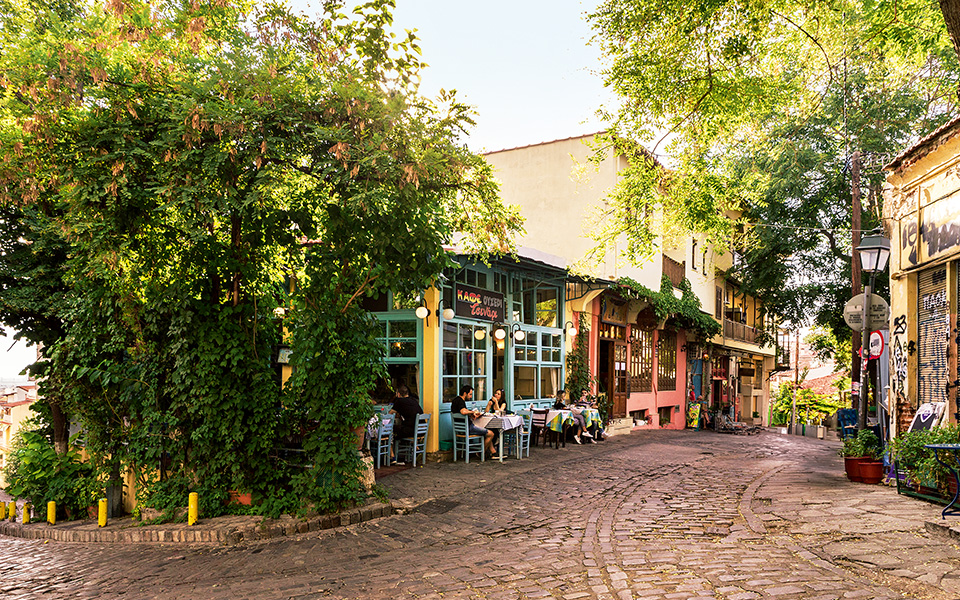 On historic Kallithea Square in Ano Poli, Stasi (“Stop”) has been operating since 2016 at the spot where a city bus stop once stood. A cooperative owned by eight former hospitality workers, it’s run according to principles of equality and shared responsibility and serves students, locals and, every Good Friday, the faithful returning from the nearby Church of Aghios Nikolaos Orfanos.
