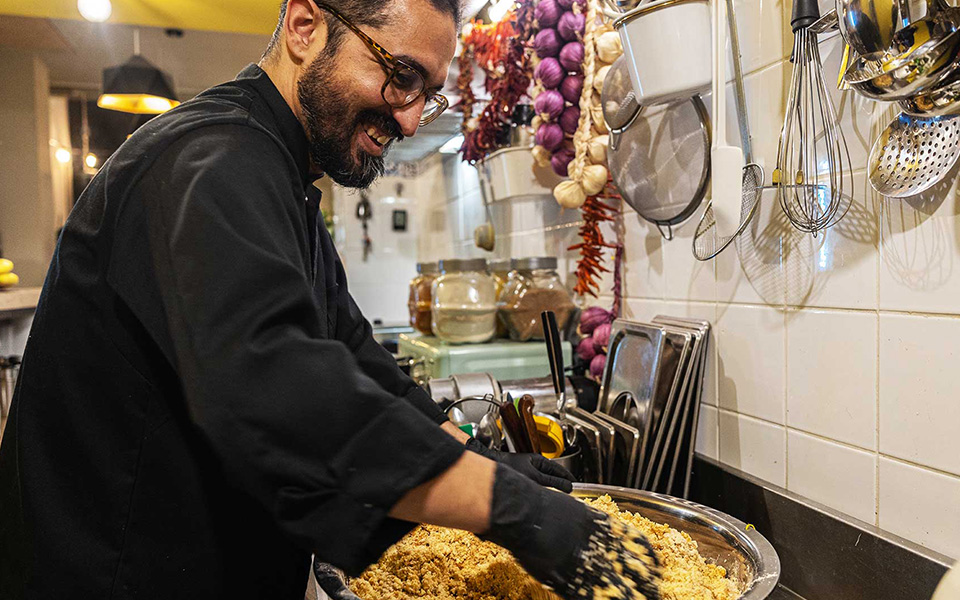 Amin prepares the mix fresh every morning without flour, breadcrumbs or egg. “Good falafel should be just chickpeas and spices,” he says. “If you fry it properly, that’s all it needs – and one round of frying is enough.” Texture, shaping pressure and oil temperature are the three crucial details, and he’s mastered them all.