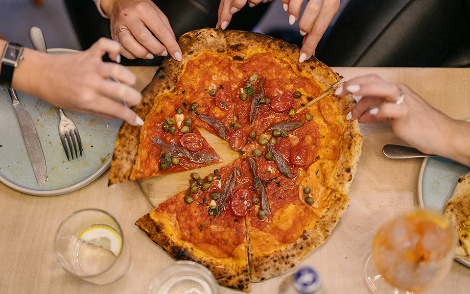 The pizza dough ferments for 48 hours before being baked fast and hot, resulting in both lightness and depth of flavor. The toppings mix Italian ingredients with a few PDO Greek products. Among the bestsellers are Mozzarella di Bufala with pistachio pesto and mortadella from Bologna; a white pizza with mozzarella, Parmesan cream, prosciutto cotto and garlic oil; and the Dacolini, made with San Marzano tomatoes, mozzarella, feta mousse from Kalavryta, pickled onion, confit cherry tomatoes and Kalamata olives.